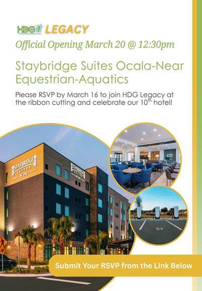 Come out and celebrate with HDG Legacy and the official opening of Staybridge Suites Ocala-Near-Equestrian-Aquatics. Arrival is 12:30pm with opening remarks at 1:00pm and the official ribbon cutting at 1:20pm. Light refreshments and tours will be available. Click https://staybridgeocalarsvp.carrd.co/ to RSVP